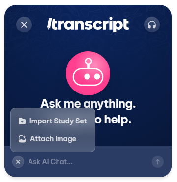 For context-aware assistance on your material, click the "Import Study Set" button found in the plus menu at the bottom left of the window. After adding your study set, you can begin interacting with it directly!