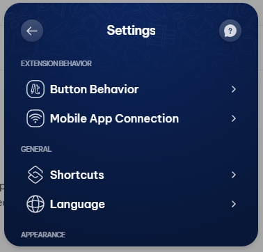 The Settings page is your control center for customizing and optimizing your experience with the extension. Here, you can adjust various options to match your preferences and needs. Access it by clicking the gear icon in the top left corner of the home menu.