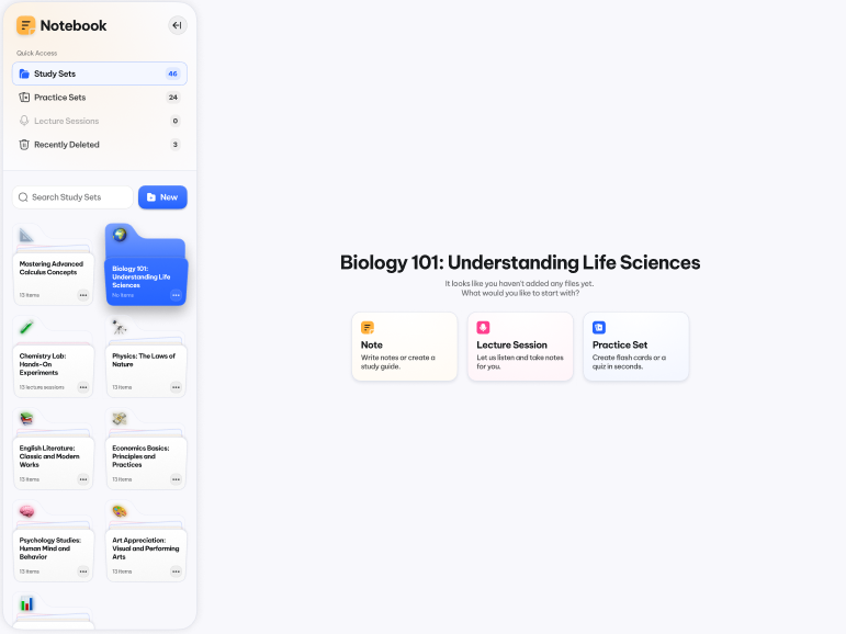 **Unlock smarter studying with Notebook.** Store notes, summarize lectures and videos, and create flashcards and quizzes—all in one place. Simplify your learning and boost efficiency with our all-in-one study tool.